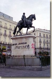 Asesinos The statue of King Charles III in Puerta del Sol on Sunday morning. Photo: Frank Caravella (click photo to enlarge)